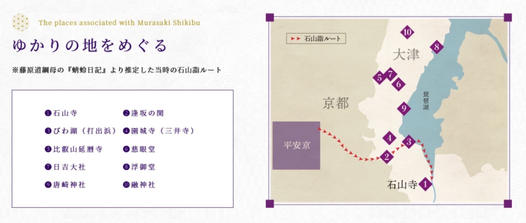 歷來配合大河劇的播出,於故事場景地方自治體設立大河劇館(大河ドラマ館),盼藉影視推動聖地巡禮熱潮,促進文化行銷與觀光振興。本次大河劇館共三處,(註2)其中滋賀縣大津市更與在地文化資產共構,展開「紫式部起筆《源氏物語》誕生地——大津」的文化觀光企畫,即圍繞於千年前石山寺皎淨月夜下物語誕生的傳說。