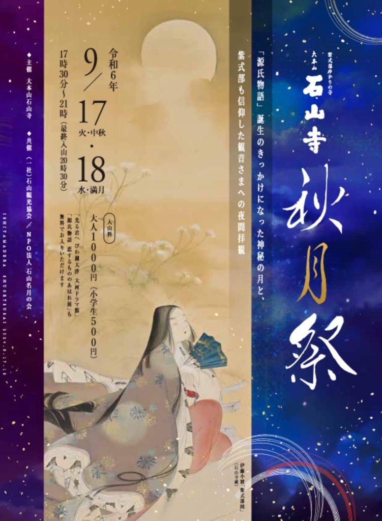 時至今日,石山寺每年中秋行事「秋月祭」(2024.09.17-18),仍會於本堂掛起《紫式部聖像圖》舉辦供養法會,於「源氏之間」供奉賞月糰子、秋季水果等貢品,作為平安時代以來的賞月名所,並歡迎眾人赴會共賞「石山秋月」。沈浸於大河劇《致光之君》的你/妳,是否考慮在內心觸動未能止息之時,踏上傳說中物語誕生之地,感受令紫式部也著迷的金秋月夜。