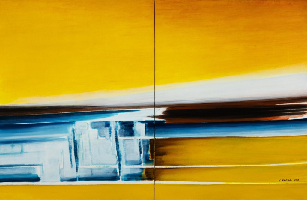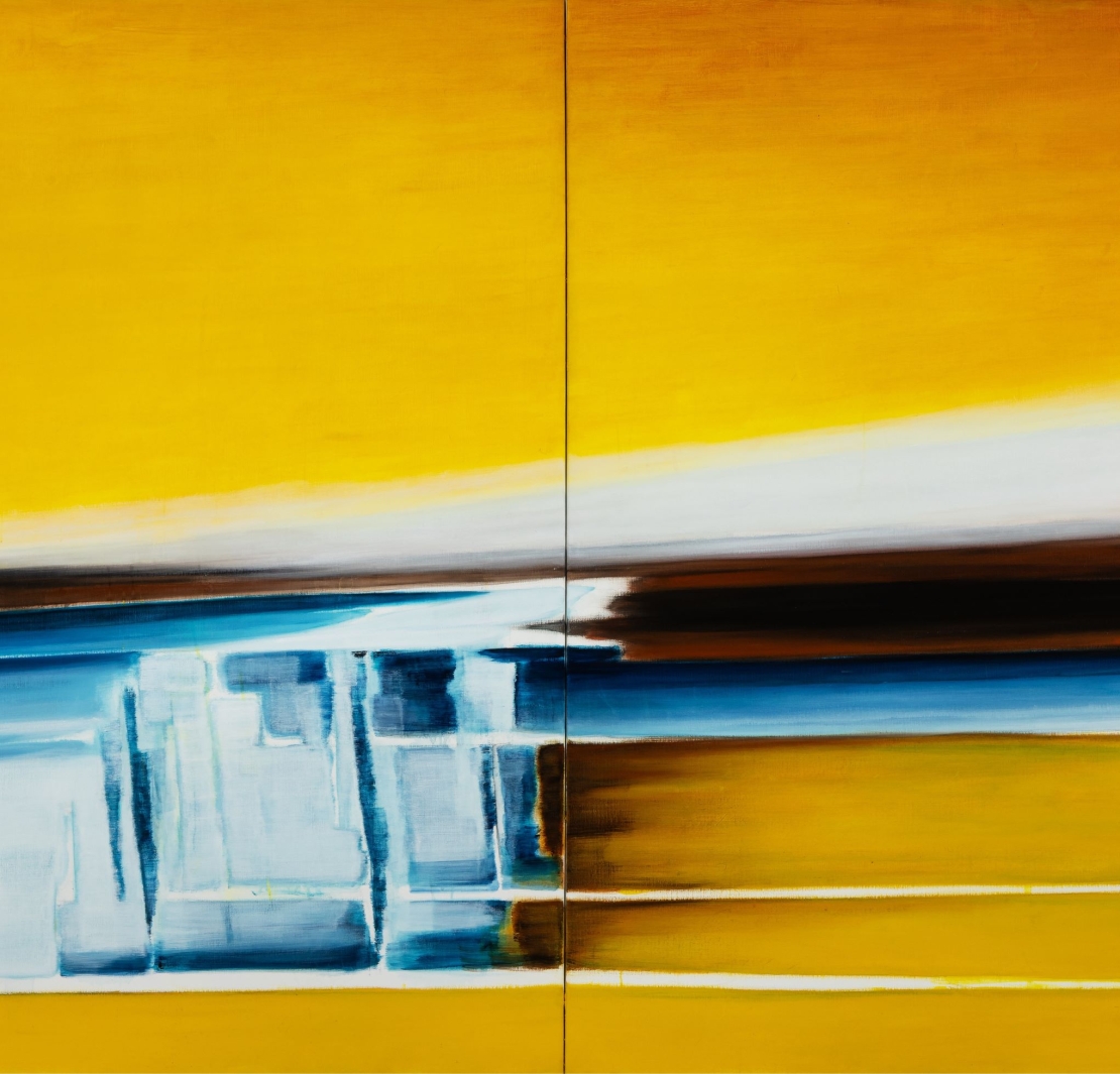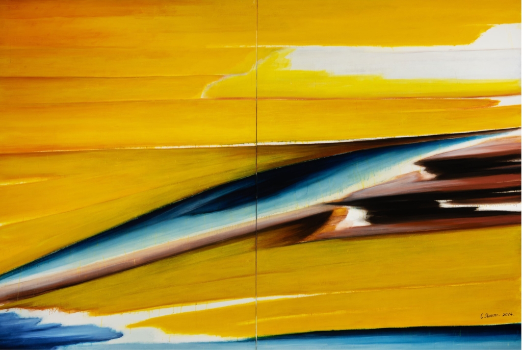 如陳聖頌的新作《黃2024之一》、《黃2024之二》和《黃2024之三》等三件作品裡的「黃」,是專屬於南國炙熱日照與夕陽餘暉的色溫光線下,所顯現的土地樸實顏色。這個「黃」,是細膩光色變化下的捕捉,以溫潤的色光澤質來浸染我們的視覺,這個「黃」,已被陳聖頌推展到某種神聖的位置,凝結出專屬於陳聖頌繪畫中的土地的色彩與精神。