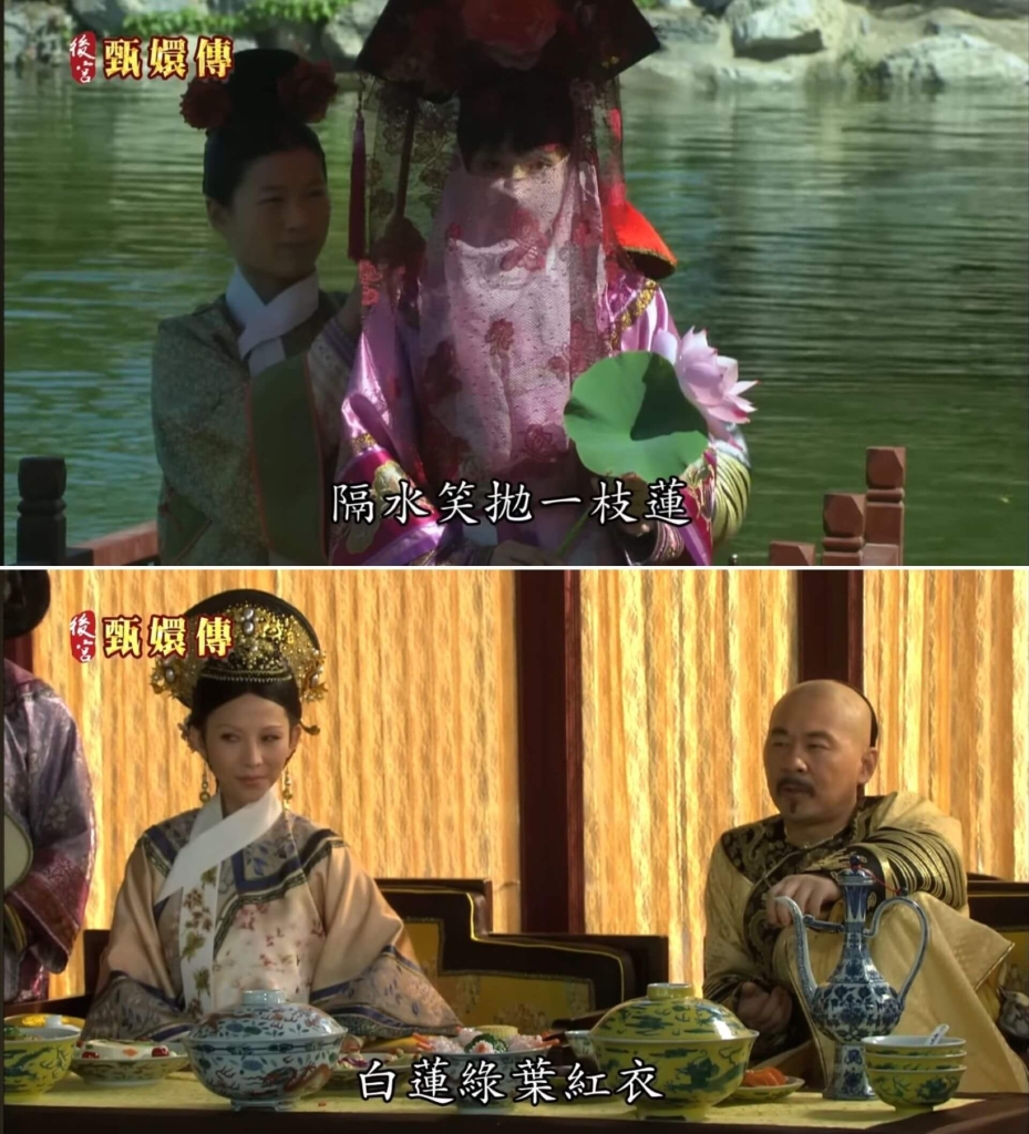 在甄嬛傳中,荷花或可說是最常出現的花卉之一,除了甄嬛暗夜裡上了蓮塘裡王爺的船,對著果郡王說自己更愛荷花的佛性。以及果郡王巧引溫泉水,使得四月裡居然也有滿池的荷花,作為皇帝贈予甄嬛的壽禮。其中最令人印象深刻的當數安陵容於滿開荷花的瓊華島太液池上,藉由一曲〈江南可採蓮〉,成功收服皇上的心。