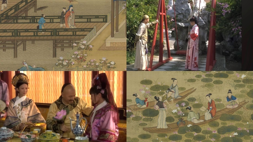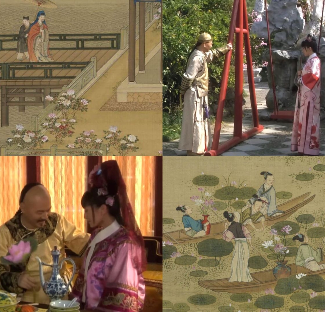 之所以在故宮藏畫中能找到如此符合劇情的畫面,是因為鞦韆與畫中其他活動如騎馬春遊、插花刺繡等,皆是符合春季的節令活動,這點或許可以說明甄嬛傳最為巧妙之處,便是將角色互動安排在宮中乃至圓明園等皇家據點的不同角落,並與隨季節變換的各式活動相互交織,成功創造出豐富多樣的場景與情境,因而每每引人入勝。