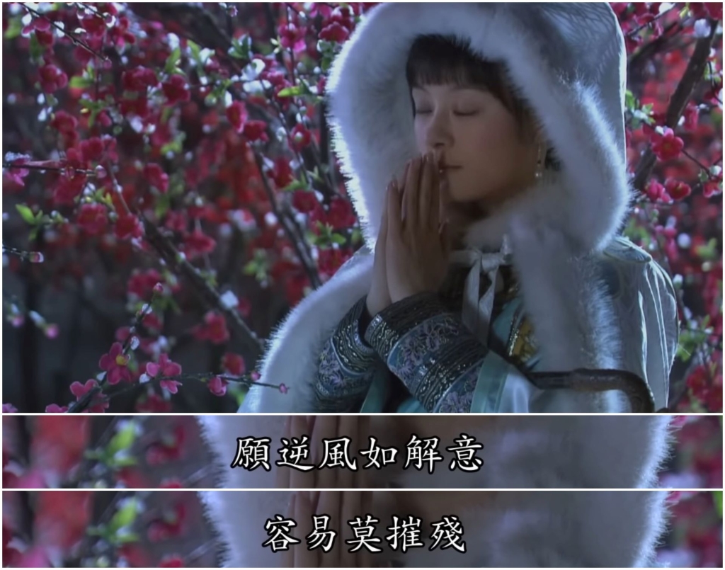 在《後宮甄嬛傳》(以下簡稱甄嬛傳)76集的劇情中,宮中女子不僅貌美如花,其生活點點滴滴,似乎也無法與四時花卉相分離,更以花為喻。如沈眉莊自比菊花「寧可枝頭抱香死,不曾吹落北風中」皇上便也附和「菊花獨立秋風,不與百花爭豔,耐得住寂寞,才能享得住長遠。」轉瞬間,皇上卻才是不甘寂寞的那個,除夕夜不好好吃團圓飯,非要在與甄嬛於花中相遇,展開一世的纏綿糾葛。