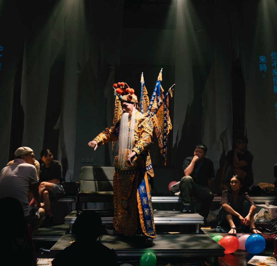不同於過往於戲曲中心裡頭上演的新編、改良戲曲或跨劇種文本,傳統的戲曲形式,在這個難以區分舞台與觀眾席的方形表演空間裡可說是蕩然無存。不過,我們依稀可以從硬體裝置看見一些線索,像是散落四處的樂手或絲竹樂器、化妝鏡,靠把老生的黃色紮巾、靠旗、髯口、靴子或兵器等事物,充當投影幕用的白幡集中懸掛空間一側。在一陣鬧哄哄裡頭,主角黃昶然自己搬紙箱來到場中央;先彈完吉他,並站上紙箱宣告(同時也在某位觀眾耳畔低語):「我並不擁有我自己。」接著,李本善的嚎叫伴隨氣球破裂,北管演奏的「扮仙」(註3)正式揭開「序場」。在這樣的氛圍下,無論是嗩吶、拜拜、神明生、光明燈,資源回收空罐、金紙、跋杯(pua̍h-pue)⋯⋯等意象,都指向龍蛇雜處的廟埕廣場,也正是台灣最早聚眾發聲的公共空間。
