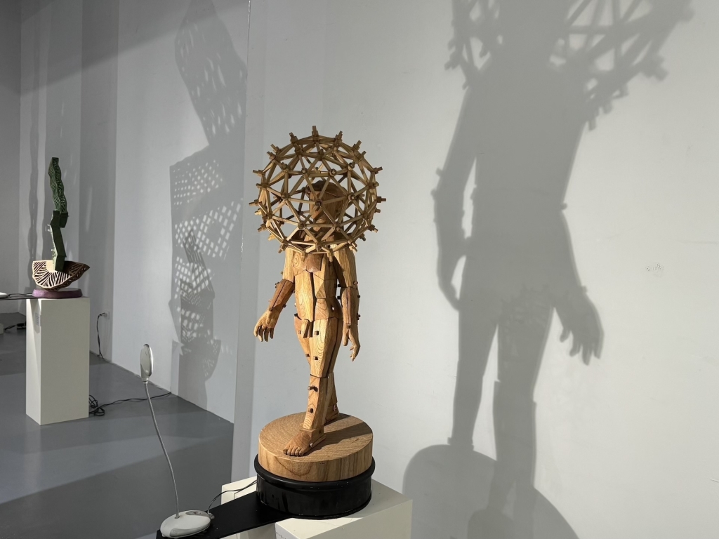 竹田光幸以雕刻核心主芯柱為基礎,逐步將木材組合,運用古建築的木結構與鎌倉雕刻的拼木技法,創作出大型雕塑,展現傳統技藝的力量與美感。圖為「竹田光幸 × 竹田智美 雙人展」展出現場。(攝影/李京樺)