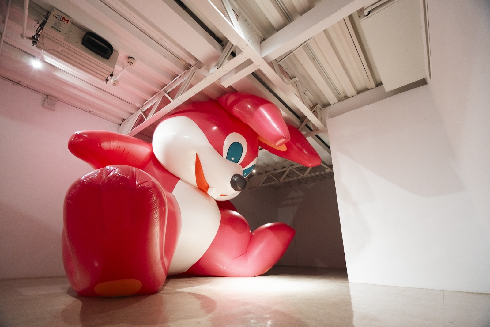 鳥光桃代的作品《總覺得有點不舒服》是一尺寸誇張的巨型兔子氣球,除了探討了現代消費文化中的童真與可愛風格之外,在雕塑的場域中,更是直指空間的意義。這些原本象徵著「可愛」與「無害」的大眾文化形象,被擴大到不合常理的尺寸、並被困在建築物內,尷尬地卡在地面與天花板之間。