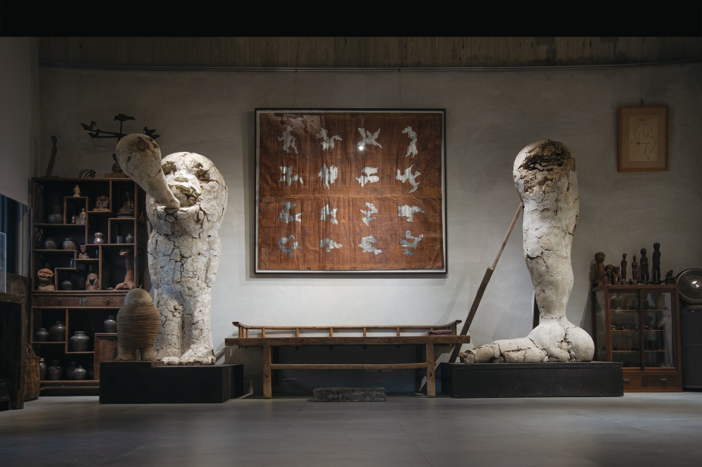 事實上,不僅是傳統意義上的東方與西方,李真的養分來源更為多元廣闊。一踏入「隱辰山居」的室內空間,便可見長長的玄關兩側陳列許多頗具部落氣息與原始藝術風格的木雕和物件,大多是李真前往太平洋群島等地旅行時帶回的,間或有東南亞和臺灣民間可見的木雕和繪畫。它們與李真早年的寫實人體雕塑、後來標誌性的墨色銅雕形體,乃至「凡夫」系列粗糙龜裂的複雜造型置身一處時,某種跨越時空的相通氣韻油然而生。