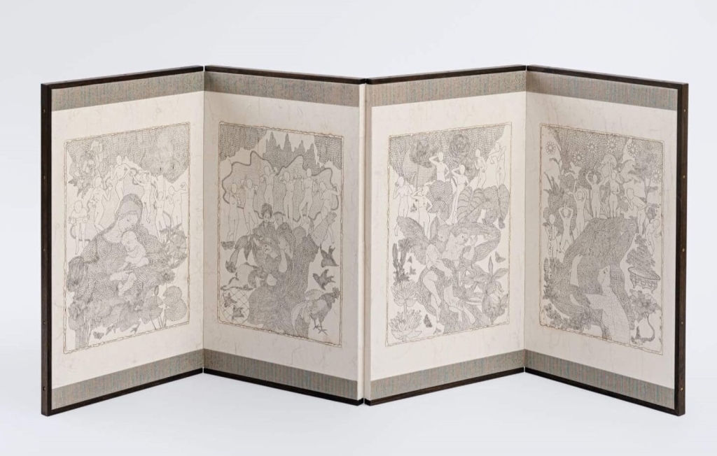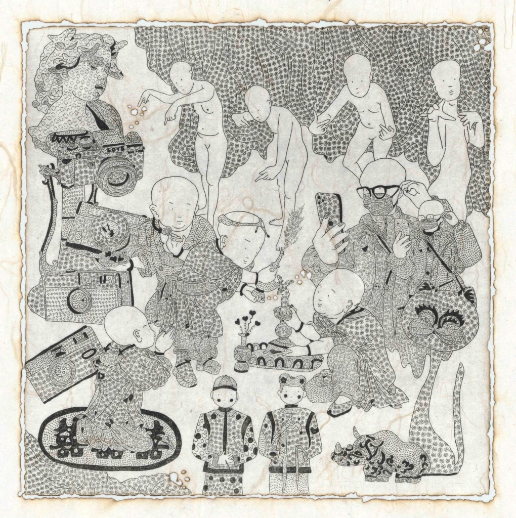 提起芬蘭的駐村經歷,那是翁榛羚第一次在國外進行長期創作。她說:「在芬蘭,我有機會與世界各地的藝術家互動,他們的創作理念與手法給了我很多啟發,也讓我重新思考臺灣文化在全球藝術語境中的位置。」《幸福觀音》便源自於藝術家與芬蘭駐村朋友交流時,他們詢問臺灣文化的樣貌。「由於我對臺灣的道教和佛教有興趣,便以觀音形象創作了這幅作品,結合了跳舞的光頭裸女,並融入宋代『嬰戲圖』的概念。」
