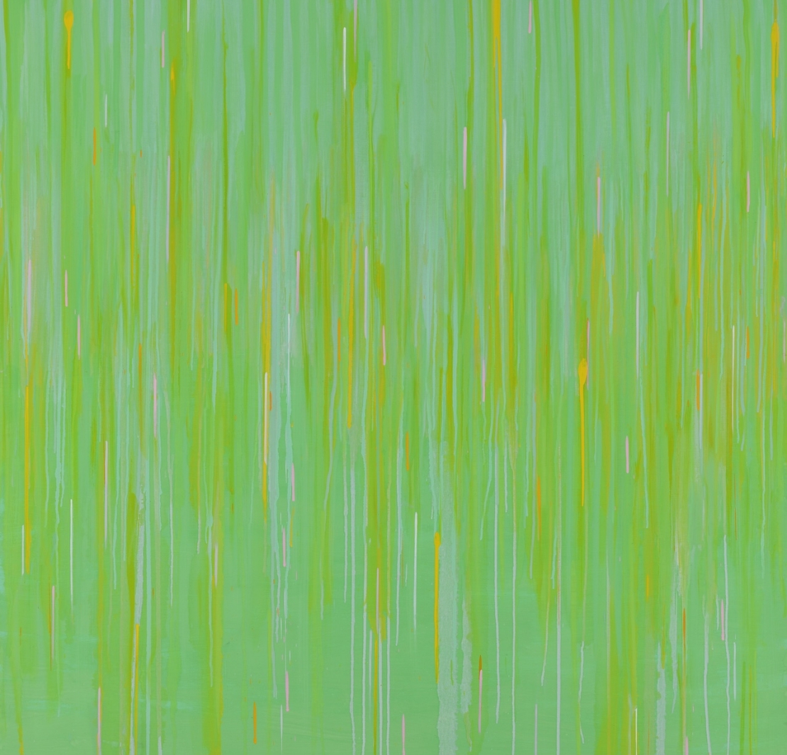 在第二組畫作中,包括《夢想與自由》、《保持輕盈》、《命運之線-1、2 與3》、《簡樸之美》、《意識流》、《延續性》以及《清晰思維》,紀嘉華運用細長的水平或垂直線條來構圖。仔細觀察,我們發現這些線條其實是經過精心控制的顏料滴落。就像他筆下那不規則的形狀,這些滴落可以是不透明或半透明的。如同他的邊界,它們可以是硬的或軟的,自然或精心控制的。此時,我們應該意識到,紀嘉華的顏料滴落有層次與色彩,因此也呈現獨特的運動與空間感。然而,有一點前所未見,那就是他有時會用筆刷混合這些滴落的顏料,幻化為條狀的色域。有時我們的目光隨著一個滴落,看見它從自然形狀過渡到混合的形態;有時,近距離觀察一個滴落,卻發現它變成了一條繪製的線。這不禁引發一個疑問:這些是顏料自然的滴落還是繪製的滴落?每種可能的動勢都改變了作品的詩性意圖。因此,我們又陷入了思考。