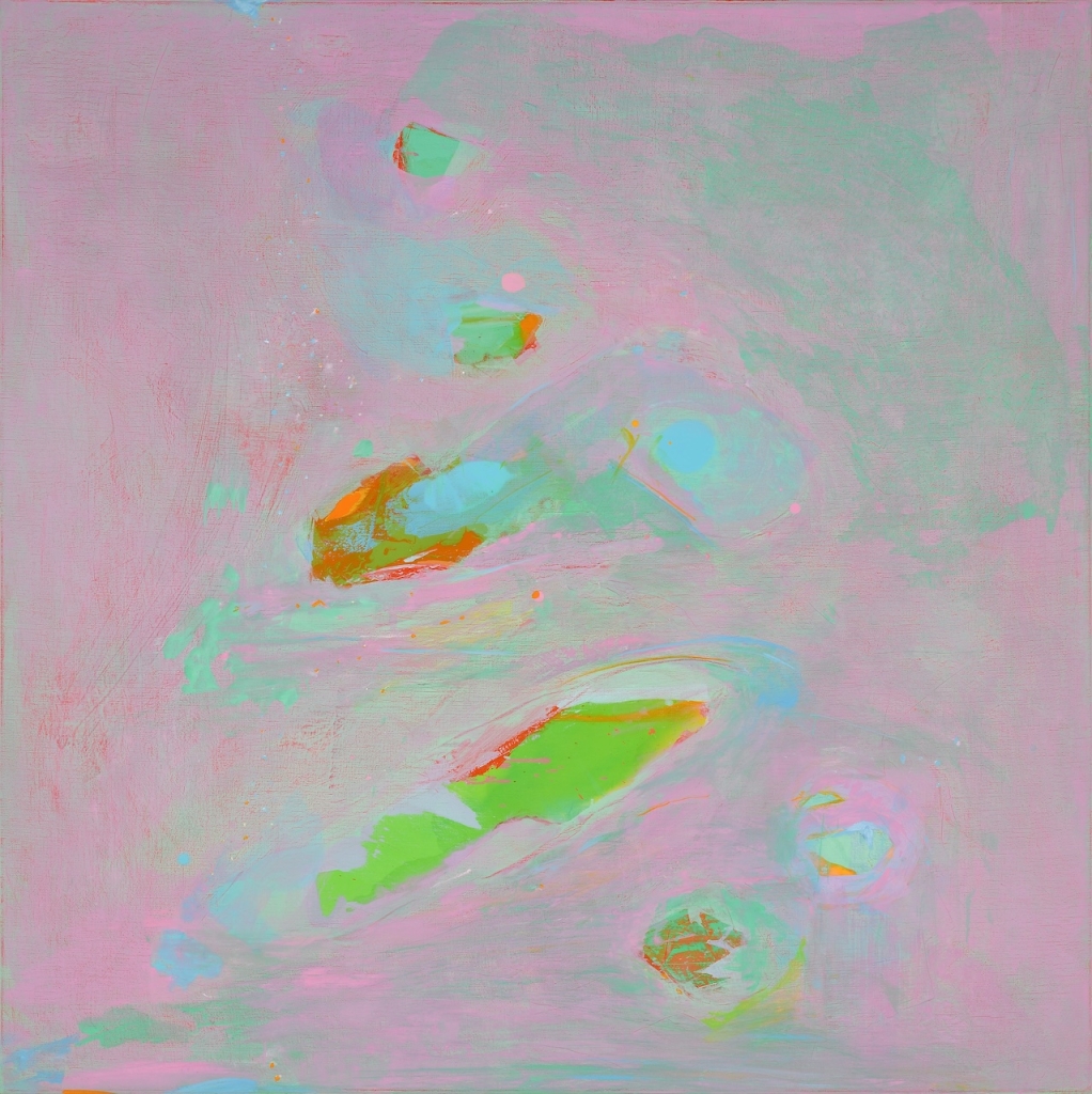 我花了數月研究和思考這個問題,得出了兩個關於紀嘉華如何實現他那令人困惑的色彩的可能答案。大部分情況下,如《旅行者的肖像-3》和《時光邊境-3》等作品中,他使用真正的粉彩,如薄荷綠和嬰兒藍,為抽象作品的整體色域定調。然而,他的許多色調 — 如《思考的痕跡-2》和《保持輕盈》中的黃與橘,或《夢想與自由》和《命運之線-2》的藍與綠 — 則處於粉彩與飽和色之間的中介空間,給人一種「柔和」但非粉彩,「鮮明」但不至於飽和的感覺。在許多作品中,他甚至會小心翼翼地涉足純飽和色調,如《深邃微妙》的紅與綠,以及《粉色宇宙》的深橘。透過將「鮮明柔和」以及深邃飽和的色調,與真正的粉彩底色進行微妙並置,紀嘉華創造了充滿飽和度變化的色域,改變並激發我們的色彩體驗。然而,這種變化十分幽微,幾乎帶有一種潛意識的效果。我們感受到明亮、鮮豔與虹彩,卻無法確定來自何方。