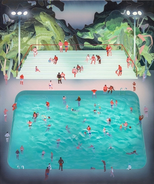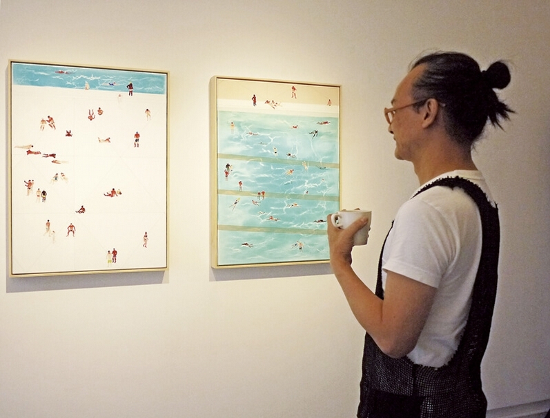 至於,為何以泳池作為創作的主題?他毫不諱言英國藝術家霍克尼(David Hockney)的「泳池」系列所帶來的啟發,但是這並不影響他心目中對泳池的詮釋。對他而言,泳池是一個特別的空間,既私密又是公共空間。「只有在這個地方,做這樣的事情,穿這樣的服裝是合理的,被允許的。但走出這個空間就沒辦法,它是既私密又開放的公共空間,這是泳池空間,讓我想持續探索的原因之一。」對他而言,在腦海裡還有不少畫面是他想說的,所以會繼續朝此系列創作。