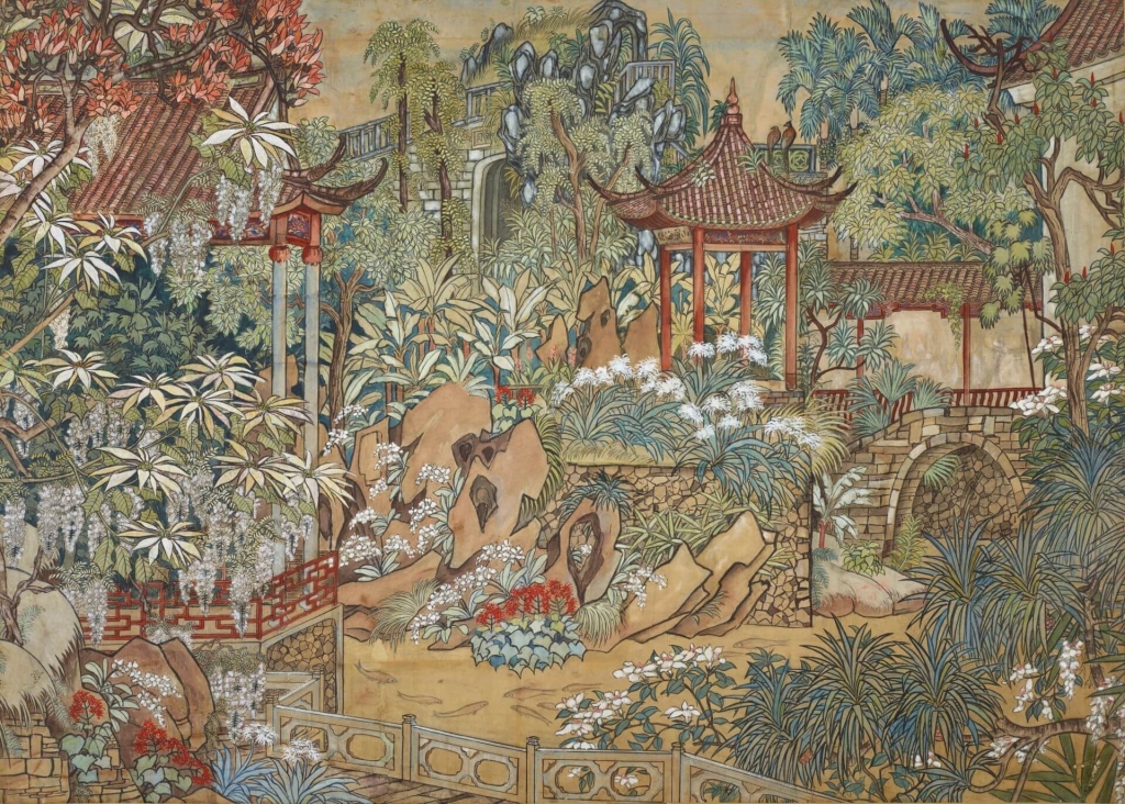 八卦亭前的假山奇石,至今仍留存於林園之中,而亭後那一段通往觀稼樓的曲折廊道,更是蘇州園林典型元素的再現。在傳統蘇州園林中,「廊」是重要的元素,廊道連接主建築,既遮風避暑,亦勾勒出步移景異的觀景體驗。廊道前排是一座拱形石橋,橋與廊間生長的綠植,暗示空間的深邃與距離感。石橋不自然的巨大比例,遠異於實景,卻為整個庭園創造了一條延伸至畫外的路徑。