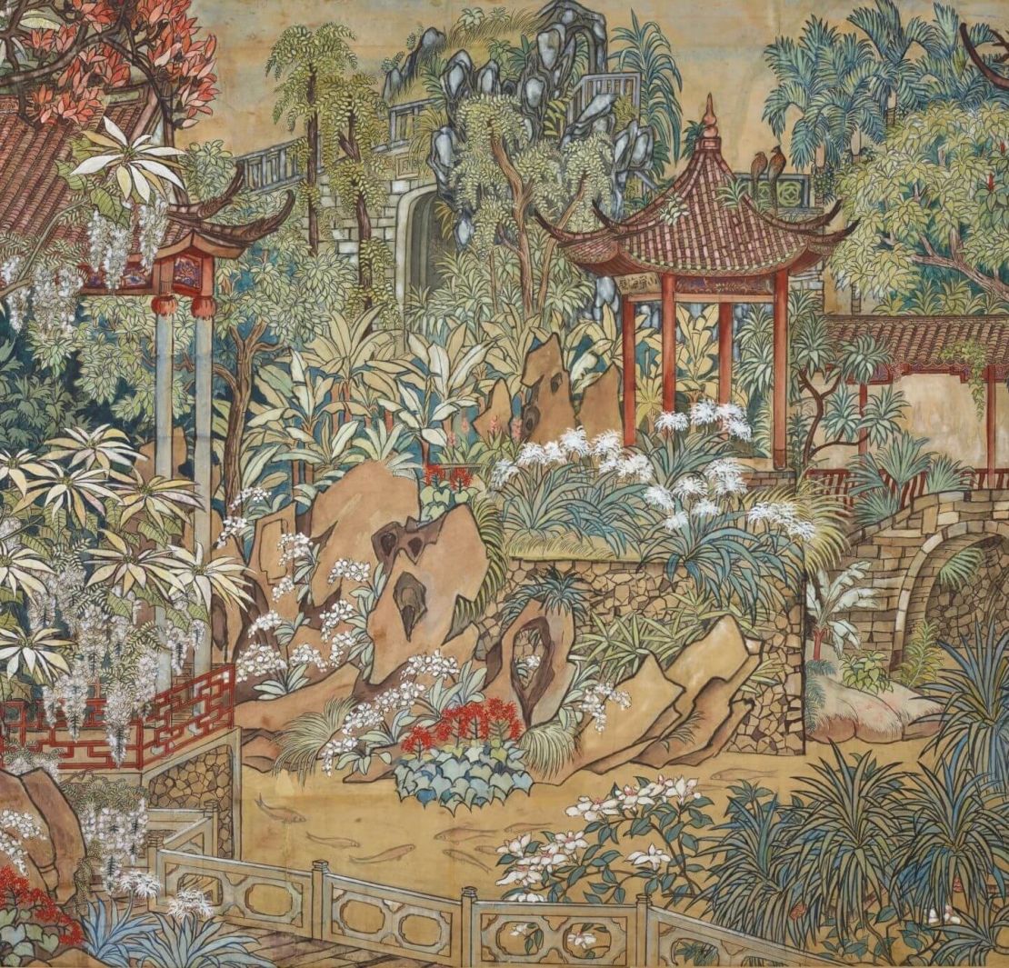 視線移至池中的奇石群,白蘭花悄然綻放於石縫間,盛開的赬桐紅花以其華麗花形,被臺灣稱作「龍船花」,花序呈傘狀,心形葉繁茂,邊緣帶有疏短尖齒,原產於東亞與南亞熱帶地區。值得一提的是,赬桐紅花也曾出現在1942年郭雪湖創作的《早春》前景中。沿著畫面的視線向上攀爬,八卦亭與奇石前,文殊蘭以潔白的身姿鋪滿地面。其波浪狀的葉緣與傘形花序成和諧之美,既是觀賞佳品,又適應海濱與水邊環境。今日走訪林園,仍可尋見其倩影。