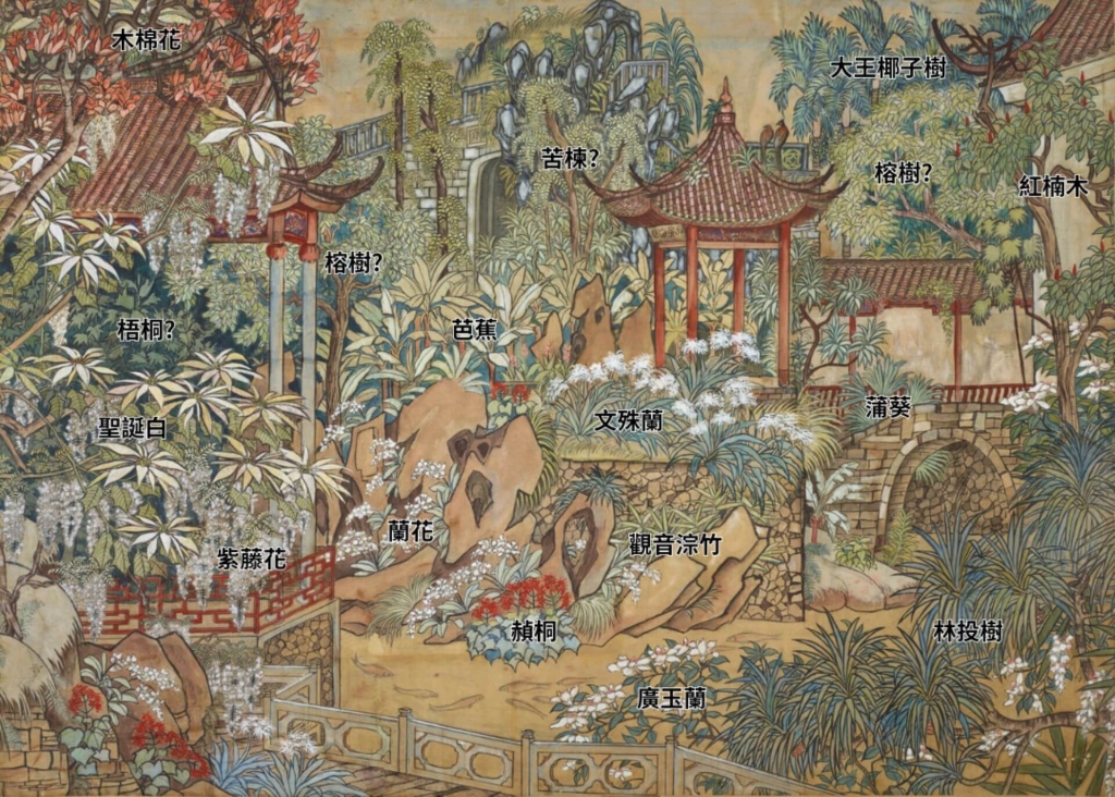 除了上述的13種植物,畫面中仍有許多植物等待辨認。例如,《薰苑》的主景——榕蔭大池,因巨榕垂蔭而得名。然而,畫中卻難以找到帶有懸垂氣生根特徵的榕樹。僅在方亭與觀稼樓附近,發現兩株枝葉繁茂的喬木,隱約符合榕樹特徵。此外,工藤彌九郎曾記載園中見過梧桐與苦楝樹,根據葉形推測,棲霞門前的樹或許是苦楝,而隱匿於方亭陰影中的可能是梧桐。究竟這幅畫中蘊含了多少植物的故事,仍有待後人細細品味與挖掘。