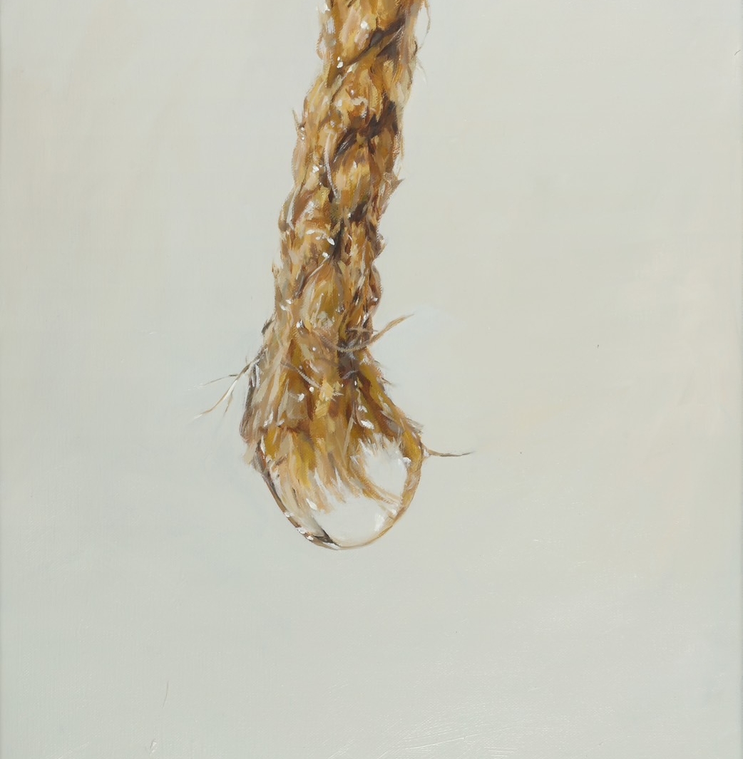 《瀅繞》系列則是將微觀水與苧麻的相吸化為符號語言,呼應王綺穗在之前的幾個系列中,對於畫布空間、材質性的表現。以這般極為單純的構圖,讓純熟的寫實技法化為一個極具象徵意義的畫面。寫實在此,不只是關於相似與否,而是再次質問我們,所見之物,在訴說著什麼樣的真實?