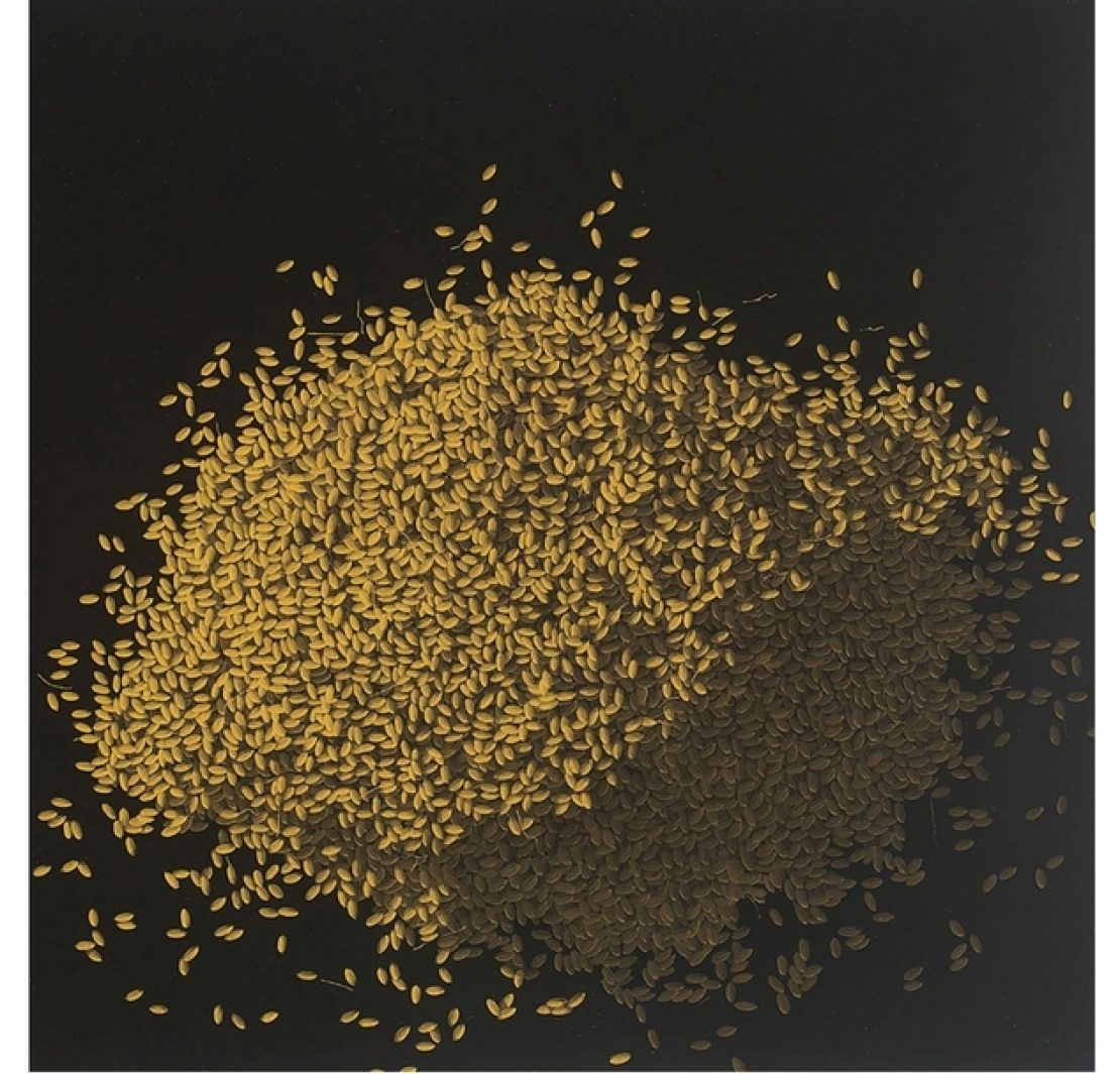 城市是難以想像土地的生長與豐收的風景,成長於南部鄉間的周佳正,他的視覺、嗅覺浸濡的感動,是稻穀收成與日曬那片金橙色、閃爍的顆粒之海,與空氣中瀰漫的米香。那是對於土地具體的想像,這東方飲食中長久的文化,藝術家從其勞動、烹煮與整個社會、世代連結創作出他日後長達12年的創作命題《種植》。每一幅單件的作品都是在完成此作品的一部分,每幅創作背後都會有一串數字,代表這個系列累積的尺幅到達多少平方公尺,這種累計的概念也回應到其做畫的方式,他逆反學院先處理大局再處理細節的繪畫步驟,直接以細刻的方式處裡每一個稻殼的刻畫,他以真實寫生的方式,描繪每一顆稻殼上細緻的光線變化,這也是他特別會以清楚的刻度來量化他在繪製上的時間、數量,並以此擬機械性的繪製方式重思機械與手工的差距;他於晴山藝術中心展出的「種植」目前有三個階段的發展,第一階段是象徵土地與天,由圓與畫布的方所構成,象徵一個靜止的原點;第二階段是擴散,以不規則的型態和技法試驗,捕捉稻穀的型態的生命力;第三階段則是填滿,整塊畫布都單純填滿稻穀,從圓到擴散到填滿,也成為一種生命的時態。