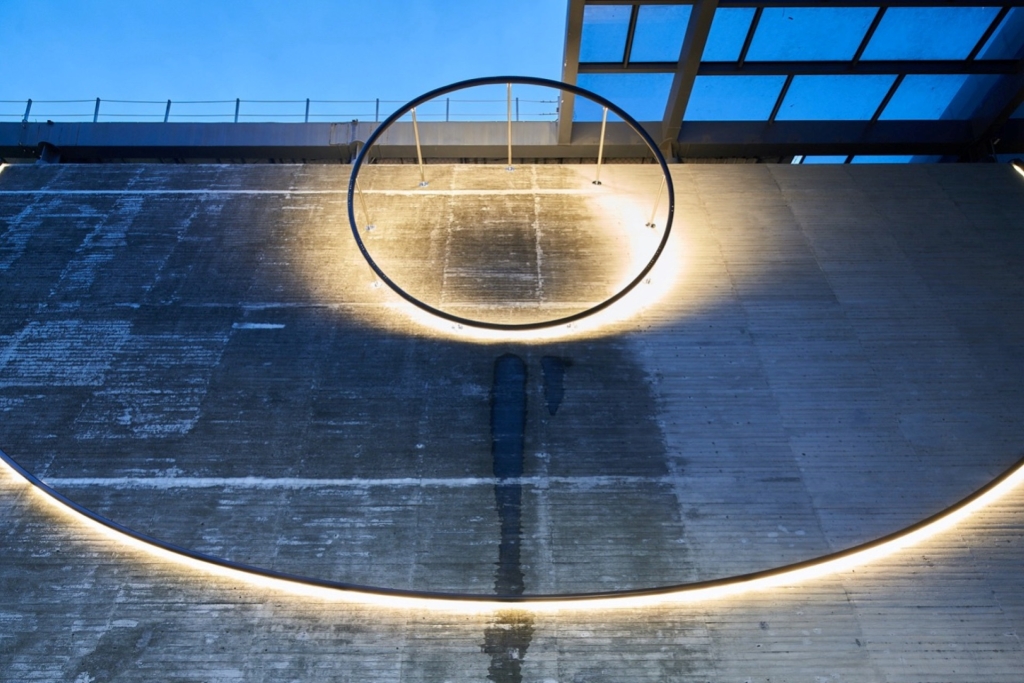 除了公共性中的住民之外,李玉玲指出「臺中市精密機械科技創新園區二期標準廠房新建工程公共藝術設置計畫」中,林舜龍的《幾何的漫遊(三角的漫遊、方的漫遊、圓的漫遊)》,與當地環境的連結也值得一提。作品聚焦於三個幾何基本形態——三角形、正方形與圓形,分別設置於三處出入口的大牆上。透過精準的黑色線條、動態的水霧與夜間燈光效果,創作出多層次的視覺與空間體驗。作品因為天候而影響到光影留下的影痕,藉此談到時間的軌跡與力度,以此呈現在天候的影響之下,所影響入口意象形成的水漬深度,呈現形成時間堆壘而來的深度。