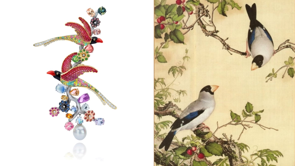 這枚胸針靈感源於清代宮廷畫家郎世寧的《仙萼長春圖冊》,以18K白金作為框架,鑲嵌超過500顆精緻寶石,包括黃鑽、紅寶石、藍寶石,並以一顆極為珍貴的南洋珍珠作為主石。設計呈現一對喜鵲於色彩斑斕的花叢中嬉戲的畫面,花果以不同色調和切割形狀的寶石點綴其間,象徵吉祥與繁榮。胡茵菲以細膩的設計語言,將中國宮廷刺繡絢麗的色彩美學與現代珠寶技術結合,成就了這件東西交融的藝術品,2018年成為由莫斯科國家歷史博物館典藏品。精益求精的胡茵菲,在同系列第二代的〈丹紅喜鵲胸針〉,重新揣摩了兩隻喜鵲對望含情脈脈的神情,比起第一代多添了一抹浪漫的色彩。