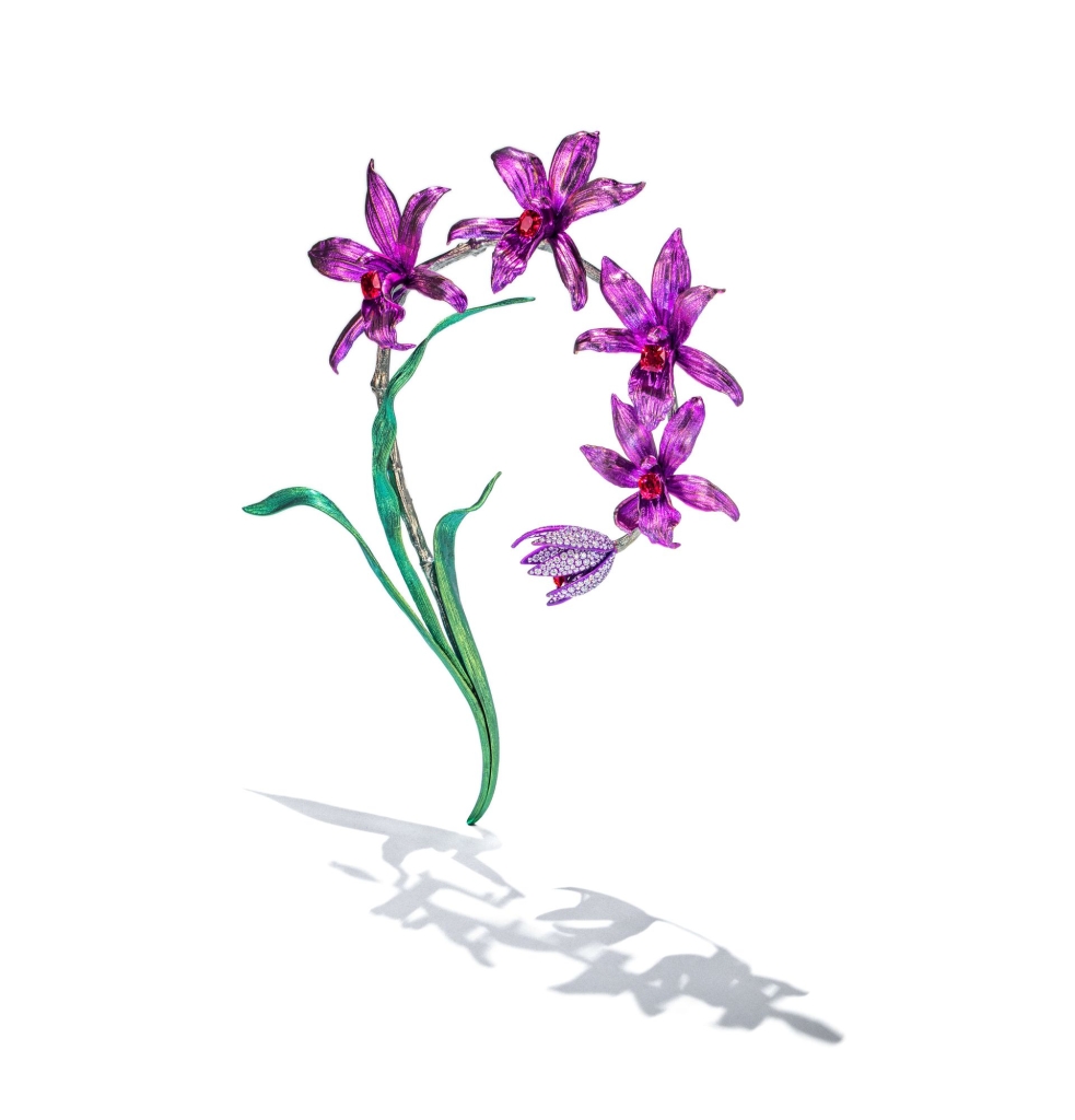 這款大型胸針的設計靈感源於張大千的〈蘭花〉畫作,以鈦金屬精心雕琢出柔美如畫的花瓣。每片花瓣經過細緻打磨,同色系層次展現出水墨畫般的流動韻律,天然無燒尖晶石點綴其中,作為花蕊,令整體設計彷如一幅可佩戴的水墨畫,雅緻非凡。胸針採用優雅的「問號」造型,胡茵菲以珠寶語言巧妙詮釋東方繪畫的靈韻,重新演繹珠寶史上數千年來對自然主義的追求與表現,創新材質的運用開創了前所未有的新視野。作品在2024年由藏家慷慨捐贈於波士頓美術博物館。