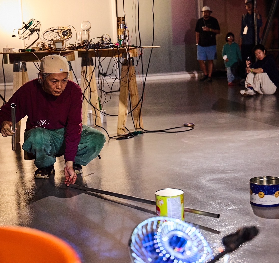 回到對梅田的提問,他提到自己透過振幅波動(vibration)的交互作用,讓不同質料的物件(如燈光、風扇、水波以及各式罐子)實現同頻共振。他以微調「重與輕的壓力」來影響物件之間連動交錯的振幅,進一步塑造整個環境的情感波動。