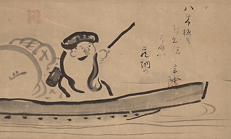 在朝岡興禎撰於江戶時代(1603~1867)末期的畫家詞典《古畫備考》中,於古磵條目下有「多寫大黑」一語;若言及古磵的水墨畫,當以〈大黑天圖〉為著名。其雖為簡筆之作,卻賦予墨之濃淡層次及墨線之粗細變化,並加以仔細的描繪,具有無論如何都使人感到討喜可愛的氣氛、且呈現各式各樣活動等特徵。所描繪者,包括了面向正面的姿態、倚靠在所攜之袋的姿態、扛袋的姿態、划船的姿態(宇賀志屋文庫藏,圖8)、搗年糕的姿態等身體運動的模樣。其中也有像圖8那樣獲得贊助之作例,成為得知古磵交友情形的重要線索。亦即,此圖是由奈良一帶的俳句詩人池西言水(1650~1722)所贊助,添附有傳達出迎接收成之秋及收穫稻米之喜悅的俳句。根據藥師寺所保留之記錄,可知古磵向該寺捐獻了超過2000件大黑天圖,似描繪了為數眾多的大黑天。