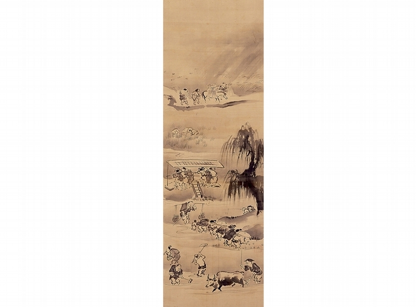 此外,古磵也以水墨畫描繪風俗畫題材。〈四季耕作圖〉(奈良縣立美術館藏,圖9)即是圖寫隨季節而推移之農忙情景的作品,自畫面下部起依序描繪犁田、插秧、水車灌溉、割稻等情景,且畫面之近景至遠景,乃由下往上展開;令人深感興味的是,舉凡灌溉和運送收割之稻穀的人物,其眼、鼻、口均予省略。不過,雖說全畫皆為簡略之筆觸,每個人物仍都予以仔細描繪,將農忙情景清晰易懂地表現出來。此外,犁田場景中的牛隻描寫,亦與古磵大黑天圖中常見的牛隻表現、以及造型、墨線、濃淡層次法、和筆觸等相一致。