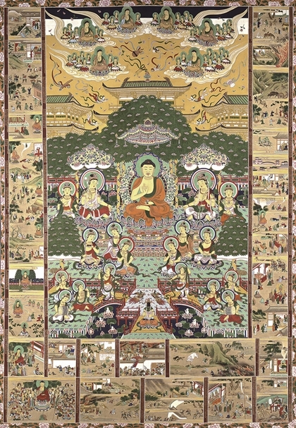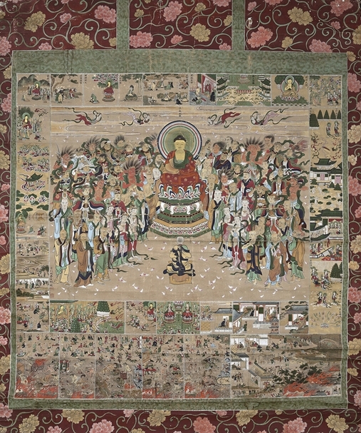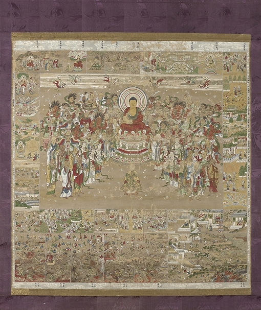 同樣藏於太宗寺的〈阿彌陀經曼荼羅圖〉(圖5),則是將淨土三經中另一部《阿彌陀經》之內容予以視覺化的作例。在《阿彌陀經》中,釋尊宣說了極樂淨土的景象及諸佛讚嘆阿彌陀佛和極樂淨土的模樣;本件作品則呈現中尊結說法印且諸尊聚集的情景,表現釋尊說法的樣子。畫幅周圍亦按經典內容描繪出各場面,並適當加上註文,以完備其內容。
