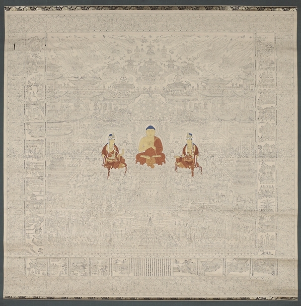 上述三件作品,儘管所依據之經典出處各異,仍能看出具有共通的構圖,亦即將主尊描繪於畫面中央,與僧侶相對,並於兩者之周圍配置集會的諸菩薩,且畫幅外圍一周設置小區塊畫面,圖寫經典之內容。值得留意的是,同樣的構圖,亦見於下節所要談到的〈藥師淨土曼荼羅圖〉。