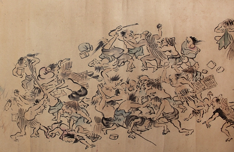 奈良縣立美術館另收藏有古磵〈人物圖卷〉(圖10)之手卷作例。此作乃是將各式身分和職業的人們圖寫出來,以身著「強裝束」的男性貴族和牛車為首,描繪出武士、僧侶、神官、學者、賣藝人、工匠、醫生、商人等姿態。當中最精采的部分,為卷末所描繪的乞丐和街市遊民之群架糾紛。唯獨此一部分,是運用古磵所擅長的群像表現,將騷亂的情景生動鮮活地描繪出來。全幅均用簡筆,且沿著衣紋最小限度地施加色彩。由這些作例,既能讓人感受到古磵對於市井小民的關注,同時也能窺見他對於群像表現之擅長。