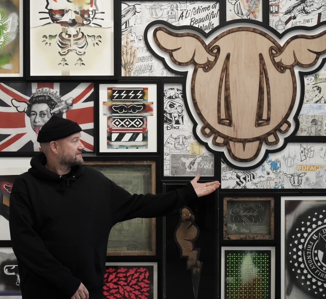 編按:D*Face(本名 Dean Stockton),1973 年生於倫敦,是當代街頭藝術的最重要代表人物之一。他擅長運用噴漆、文字、海報及模板塗鴉等多元媒材,構建出一套叛逆大膽且充滿視覺張力的藝術語彙。透過挪用、重構與解構主流視覺符號,他將主次文化的界限模糊化,創造出具有深層批判意涵的美學符碼,藉此對資本主義過度崇拜及其潛在的全球隱憂進行戲謔的針貶與反思。