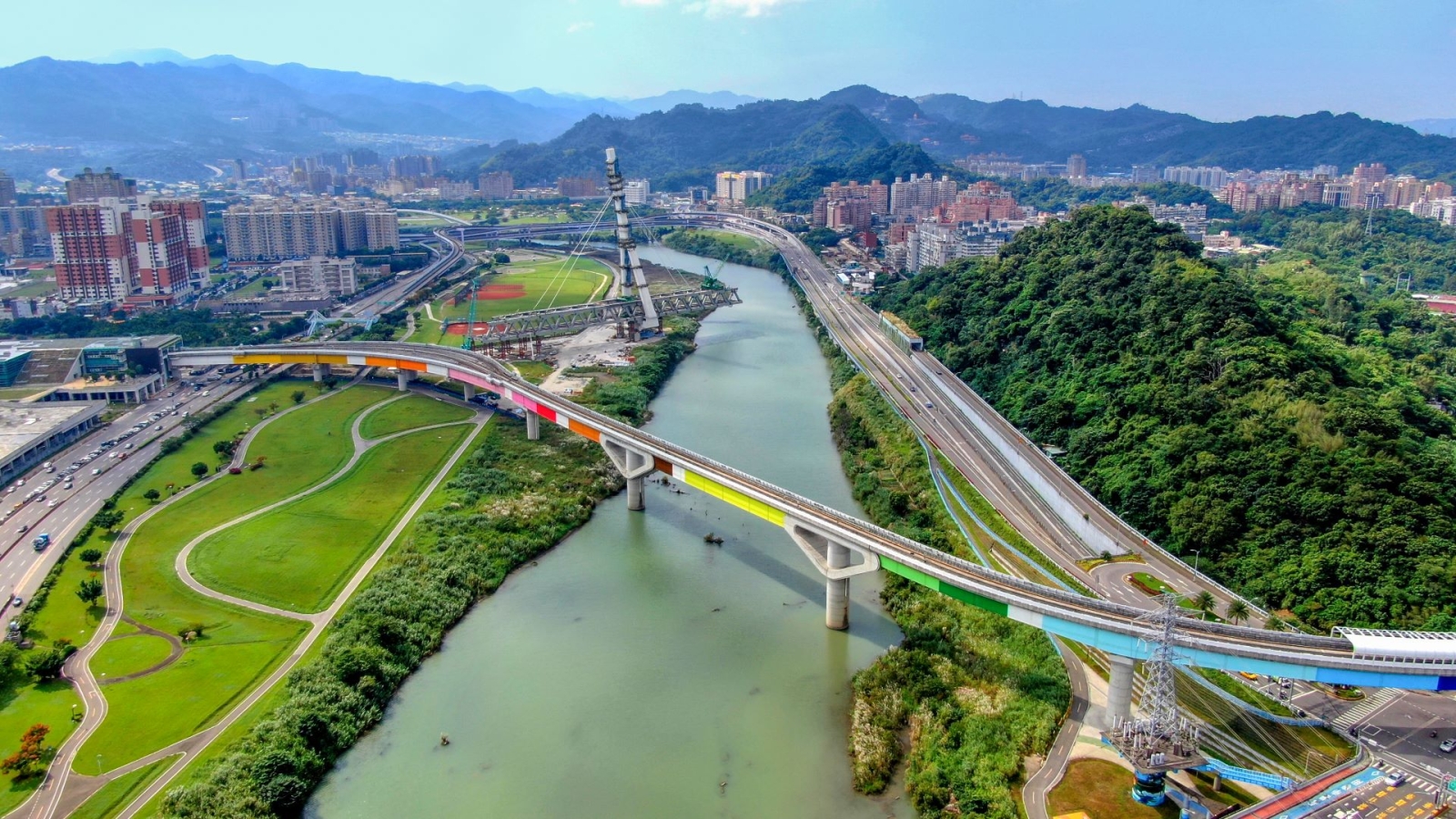 作品《粼光》為藝術家莫侯依據車站的地緣特色,為環狀線全線制定色彩計畫。圖為捷運環狀線過新店溪段。(文化部提供)