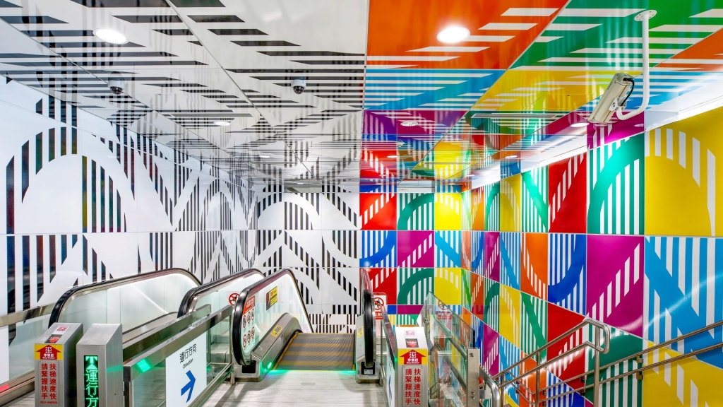 第二區公共藝術《思映之間》,則與經手多項大眾交通公共藝術案的布罕合作,他在這件作品的構思上,不僅是依據地點的建築,也會參考在地情況與整體氛圍和功能性。例如每天成千上萬的人如何進出車站,並擦肩而過?他們能否看到自身所在的環境?如何加強人們的視覺記憶?(註1)《思映之間》位在環狀線板橋車站室內外裝,是布罕以他極有代表性的「8.7公分寬」垂直條紋色帶為創作主軸,構成八種色彩的幾何圖樣,採用穿透、對比的策略,有延續性地擴展至站內天花板、樓梯壁面以及車站墩柱地面;並且將車站劃分為黑白與彩色兩個鏡面的分割區塊,被布罕形容為「彼此如乒乓球般互相回應」。(註2)此外,站內的板片也配合《思映之間》的「8.7公分寬」,以其倍數121.8公分重新裁切設計。而大樓東側整面建築外觀牆面上,以立面巨型的黑白波浪圖騰呼應「流水行雲.龍遊千里」之題眼。站內月台門也以飾以8.7公分寬的條紋,在列車進站時隱蔽,出站時錯落出條紋光影。月台層上方則橫跨兩道由8.7公分寬LED燈盒所組成的彩虹燈帶,在列車進出站時流動閃爍,與列車交織相互輝映的視覺變化。