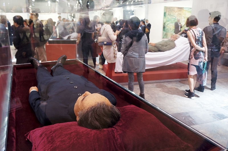 除了抽象及感知層面的描述,此次藝聚空間對時間的詮釋也有自現實環境變異與政治面向切入討論的作品。如菲律賓藝術家阿巴德(Pio Abad)的《Not a Shield, but a Weapon》便是藉由180個柴契爾夫人(Margaret Thatcher)標誌性的Asprey London的黑色皮革手提包仿製品,連結過往因皮革工業蓬勃,卻又因1990年代貿易限制放寬影響而沒落的菲律賓馬利金納市,藉此討論當時柴契爾新自由主義政策所帶來的破壞性影響,以及由資本主義、殖民文化所構築出的「理想生活」幻影。而在中國藝術家沈少民的《峰會》中,他讓歷史上幾位重要的共產主義領袖在展會中聚首(卡斯楚、列寧、毛澤東、金日成、胡志明),但他們若非奄奄一息地躺臥病榻,便是早在水晶棺中長眠不起。藝術家在這場鴉雀無聲(但被喧雜的觀眾充斥)的峰會中,試圖反思當時社會主義先驅所提出的理念在此時代是否合用。