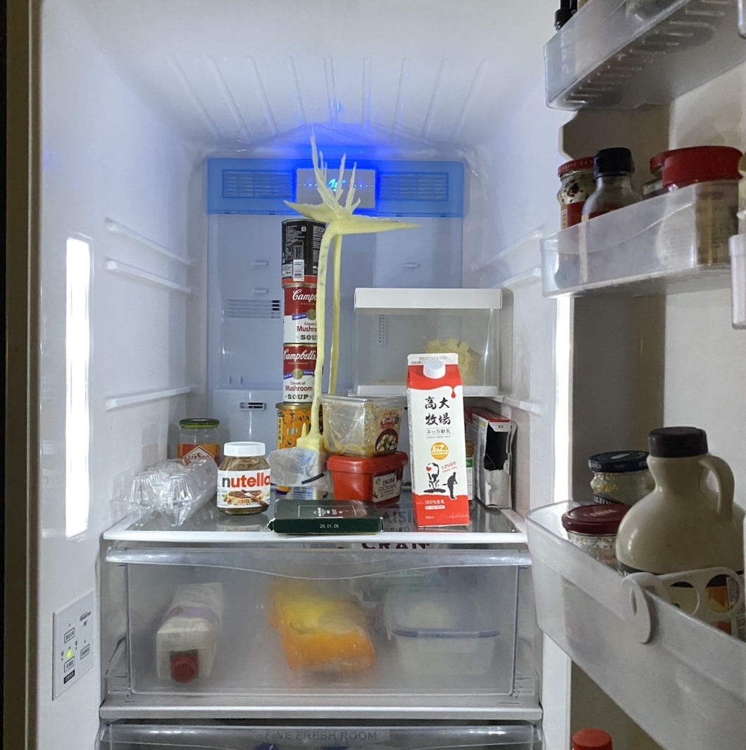 他們在林安芃的住處的不同角落留下了許多創作,鞋櫃邊、餐桌上、客廳沙發、牆上、陽台、浴室,甚至廚房流理台與冰箱裡,藝術家就像對到來的朋友介紹家中格局那般導覽著作品與居所。我試著條列出那些令我印象深刻的藝術物: