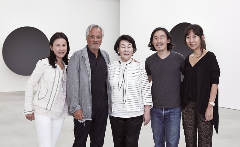 由左至右:李賢淑大女兒Tina Kim,藝術家卡普爾(Anish Kapoor),李賢淑,李賢淑兒子Charles Kim,二女兒Suzie Kim合影。(攝影/Keith Park‧圖片提供/Kukje Gallery)
