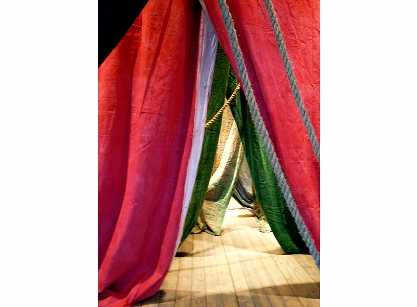 2010 年,當代藝術家布蘭登柏格(Ulla Von Brandenburg),卻用多層布廉的拉開裝置,造出戲劇性的景深,此刀法可視為重砌出景場空間的一種再現法。圖為2012 年布蘭登柏的現場裝置。