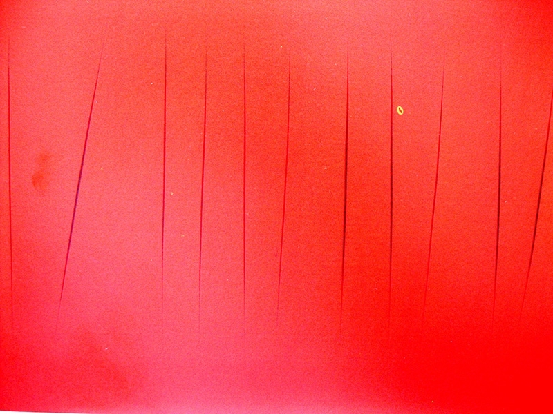 封塔那(Lucio Fontana)在畫布上割劃,以空間美學的破壞,打被了繪畫藝術的既有的平面規範。圖為封塔那後期系列〈Concetto Spaziale “Attese”, 1966〉,在紅畫面上劃切出空間。