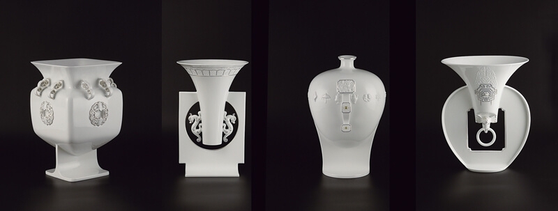 王俠軍新作「人間四喜」系列,由左至右為大福、展祿、鴻壽、圖禧,造型參照了「尊」、「觚」、「梅瓶」與「春瓶」此四種傳統型制。圖/八方新氣