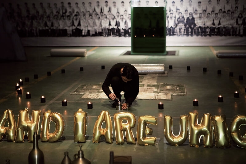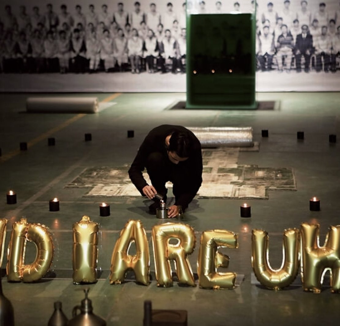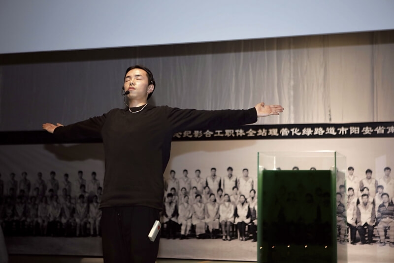 儀式開始前,所有的「法台」是提前準備好的,所有藝術家的作品對稱式的被布置完好,以莊輝一張《西元1997年10月13日河南省安陽市綠化管理站全職員工合影紀念》(1997)照片為始,吳山專的《碟蛙(鐘)》為尾。中間儲運的《綠水》(2006)、何岸的《吉岡美穗》(2015)與《能夠所有的痛苦和悲傷還能夠死亡》(2012)、胡向前的《向前美術館》(2012)、闞萱的《一個僧人》(2005-2006)、林科的《星際旅行》(2013)、李燎的《XL》(2015)與《一記》(2015)、劉韡的《轉變》(2014)、苗穎的《手拿菜刀砍網線》(2015)等一切作品轉換為儀式場上的配角。