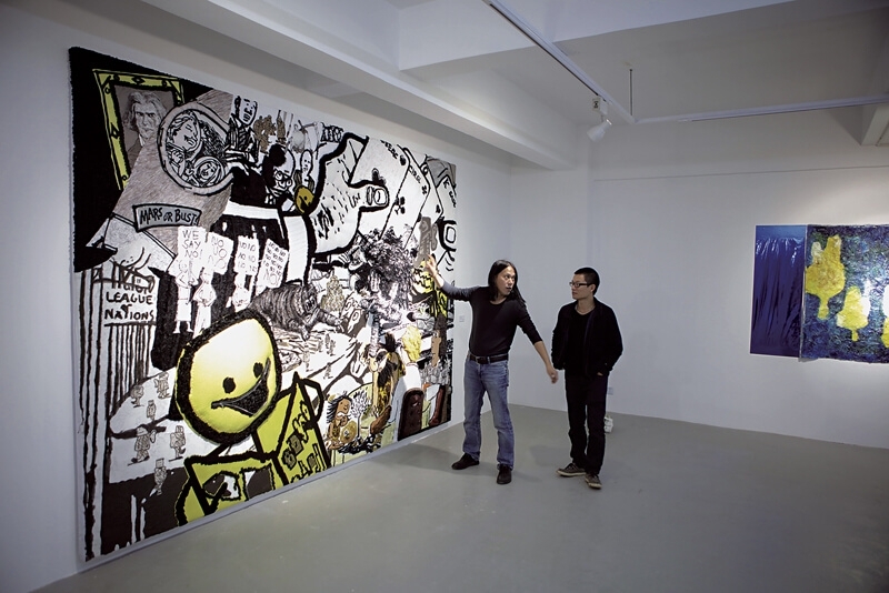年輕的藝術家中,1980年生的高磊,善於通過繪畫裝置等創作方式對周遭日常物進行轉譯與合成,近幾年來頻頻在博覽會上嶄露頭角。他的工作室就像畫廊空間,有序、整潔。跟他的作品一樣,介於秩序與混亂、冷酷與詼諧之間的形態呈現;畫如其人,大概就是這個道理。除此之外,藝術家工作室開放的還有趙要、劉唯艱、周嘯虎、潘勁農、李青、陳彧凡、王一等藝術家。