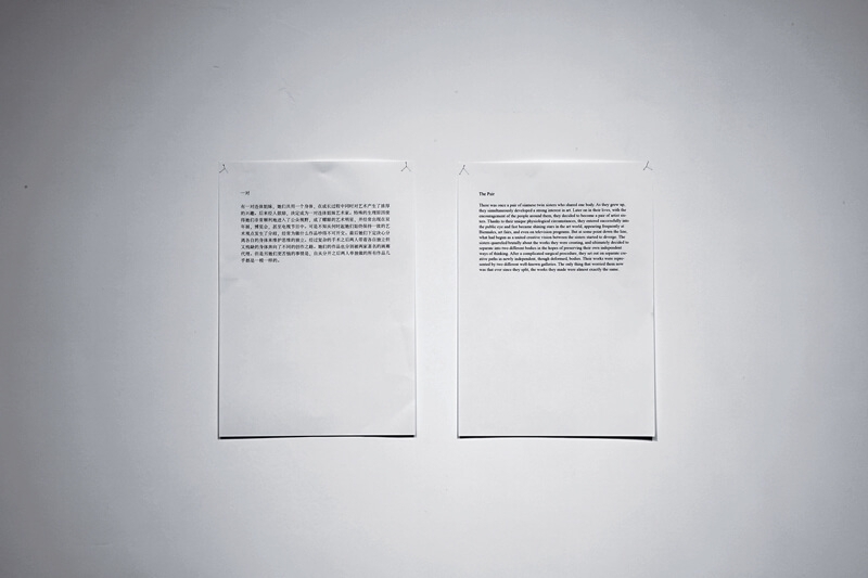 展出的作品超越了物理媒介的範圍,觀念意識厚重,但作品形態空靈。展覽場館有三個空間組成,進入場館會看見布滿牆面的文字,正是周大為作為本次展覽策展人對藝術的理解,就像這場展覽的前言一樣向展間深處蔓延。 進入第二個空間,即藝術家陸平原的作品《一對》。只見牆面貼著白紙,紙上有一段約300字的小故事,講述一對共用身體的連體藝術家姐妹,因特殊的生理狀態而聲名大噪,卻因為對創作理念的衝突進行剝離手術,然而分開之後的姐妹,創作出來的作品卻還是一模一樣。