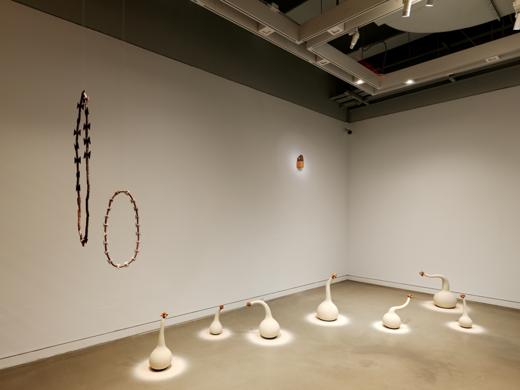 同樣的表態也發生在使用陶瓷材質的梁瀚云《Return》與賴科維《一些杯子》(評審特別獎)之間。梁瀚云的《Return》詩意十足,白色陶瓷葫蘆咨意生長出北斗七星,以及透過燒瓷呈現出不同圍牆刺網銳利質感的溫柔形體,當觀眾走進作品之間,其陶瓷的材質,所帶來清亮、同時易碎的空間身體感強烈,更凸現梁瀚云對自身童趣回憶的探索。