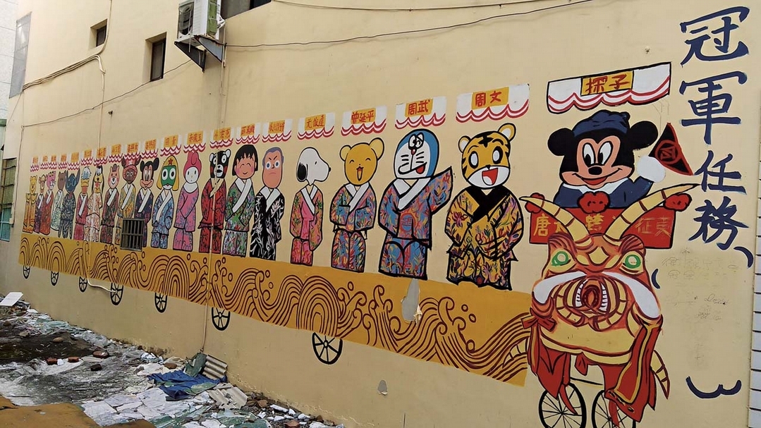 蜈蚣陣是台南別具特色的藝陣之一,「唐太宗征東」則是常被選擇的主題之一,該圖結合藝陣形式,換置不同的卡漫角色在其中。圖│吳牧青