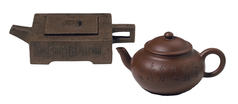 紫砂壺上的印記和款識是富有特色和魅力的,這些痕跡記載了製陶藝人的身分地位,以及文人參與紫砂器的創作過程,體現了濃厚的文化氣息。為了幫助一些不熟悉中文的觀眾欣賞展品,我們在展櫃裡以有限的文字標注,儘量加入英文翻譯和典故的簡單解釋。V&A博物館收藏有款識的紫砂壺並不多,但也有一些可觀的例子。如19世紀初楊彭年製〈晉泰和五年磚壺〉(圖2左),此壺是W. Sedgwick於1939年拍賣購得,後來捐贈給V&A博物館。楊彭年,清嘉慶道光年間著名紫砂製陶藝人,時被陳曼生(1768~1842)所看重。此壺根據古代方磚塊造型,一邊印有「晉泰和五年」字樣,晉泰和五年即公元370年,壺把有「彭年」印,蓋款「宜園」,宜園即喬重禧(1793~約1840),上海人,工書,精通文物鑑別。壺底又有「卿審定」印,卿身分不祥,但這些印款均記錄了紫砂壺創作和欣賞過程作為一種集體活動的表現,以及製陶人和贊助人之間能有的密切往來。同時,此紫砂壺造型古拙獨特,又能反映出晚清時期的讀書人對金石學的一種追求。