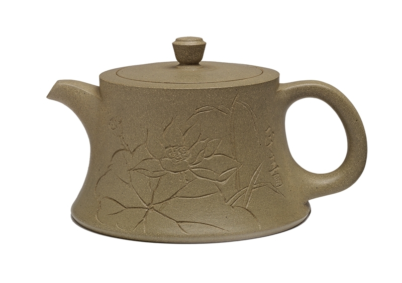 另外,V&A博物館近年又獲錢秋虹(1963~)和錢盈盈(1984~)母女慷慨捐贈紫砂壺。錢秋虹師從其母親華冠群(1931~1998),華冠群則是跟隨宜興鐫刻藝人蔣永西(1900~1957)學習陶藝,後來再繼續發展,在1950年代加入了蜀山陶業生產合作社。這次展出錢秋虹的〈樹癭壺〉(圖4),胎色黃褐,器身布紋,像斑駁的老樹癭。此壺身的造型是根據相傳為紫砂壺鼻祖供春(約1506~1566)的作品創作的,現藏中國國家博物館。錢秋虹的女兒錢盈盈年輕有為,作品往往造型新穎,是次展出她製作的〈荷花壺〉(圖5),造型在「柱壺」傳統壺式的基礎上加以改造,腹身內凹,底部向外撇,胎色也比較特別,呈淡綠色,壺身一面刻荷花圖。錢秋虹和錢盈盈所屬的紫砂系統,被稱為「華派」,最近三代傳人都是女性。當代紫砂陶藝中有不少傑出的女陶藝家,這也是紫砂藝術傳承中的一個特點。