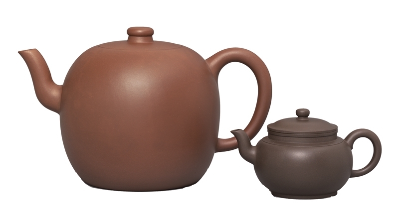 紫砂器的發源地——江蘇宜興生產陶器歷史悠久,但是以紫砂陶製作茶壺則為時較晚,而且是經歷過一個容量由大變小、功能由煮水煮茶轉化為泡茶器的過程。現時學界一般認為此發展大約是在明代萬曆中期左右完成的(註3)。1966年在南京中華門外明代司禮太監吳經墓(葬於1533年)出土的嘉靖早期紫砂〈提梁壺〉,身高17.7公分,便應是器形較大、主要用於煮水煮茶的早期紫砂壺。但是現時存世完整的晚明清初大型紫砂壺相當罕見,要在博物館陳列裡展示此歷史脈絡,一般只能複製圖片給觀眾作參考。V&A博物館非常有幸,於今年年初獲得陶藝家高振宇(1964~)捐贈專門為V&A博物館製作的紫砂隱元大壺(圖1左),讓我們能把紫砂壺的早期發展過程,以陳列的方式介紹給觀眾。