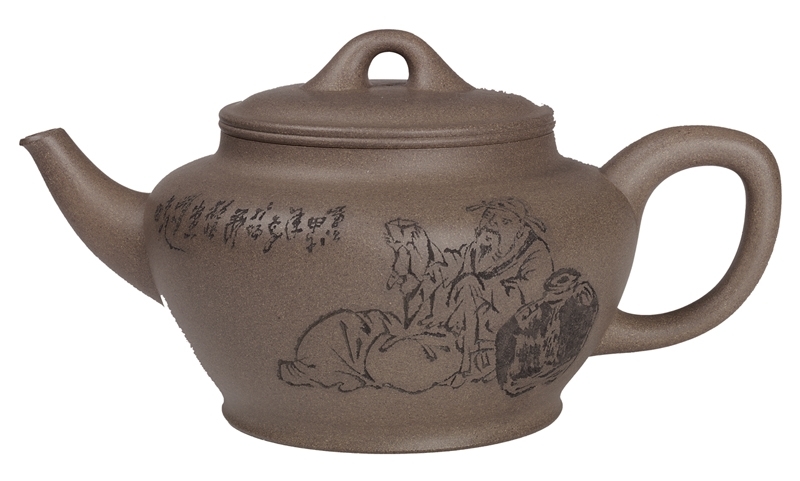 展覽中另外一個例子是邵景南(活躍於1821~1850)製作的朱泥〈水平壺〉,邵景南為晚清紫砂八大家之一,喜作詩文銘,作品造型工整(圖2右)。他在此壺身上以行書刀刻唐代詩人杜甫(712~770)〈月〉中首兩句:「天上秋期近,人間月影清」,落款名號「留佩」,底有邵景南印。這些印記和款識明確表達了邵景南作為此紫砂壺的製作人和刻書人,以及他個人的文化修養。V&A博物館一共有兩件邵景南刻有杜甫詩句的紫砂壺,同是於1984年在藝術市場上購得。V&A博物館的中國陶瓷收藏中一直缺乏刻有款識和繪畫、圖文並茂的紫砂壺,近年來獲捐贈施小馬(1954~)製、顧躍鳴(1958~)刻繪,兩位共同合作創作的紫砂壺,一面鐫刻「醉仙」大字,另一面刻繪李白倚缸醉酒圖像(圖3)。此紫砂壺剛好彌補了博物館這一紫砂壺類型的空白,並且展示了紫砂鐫刻工藝在當代作品中的保存和發展。
