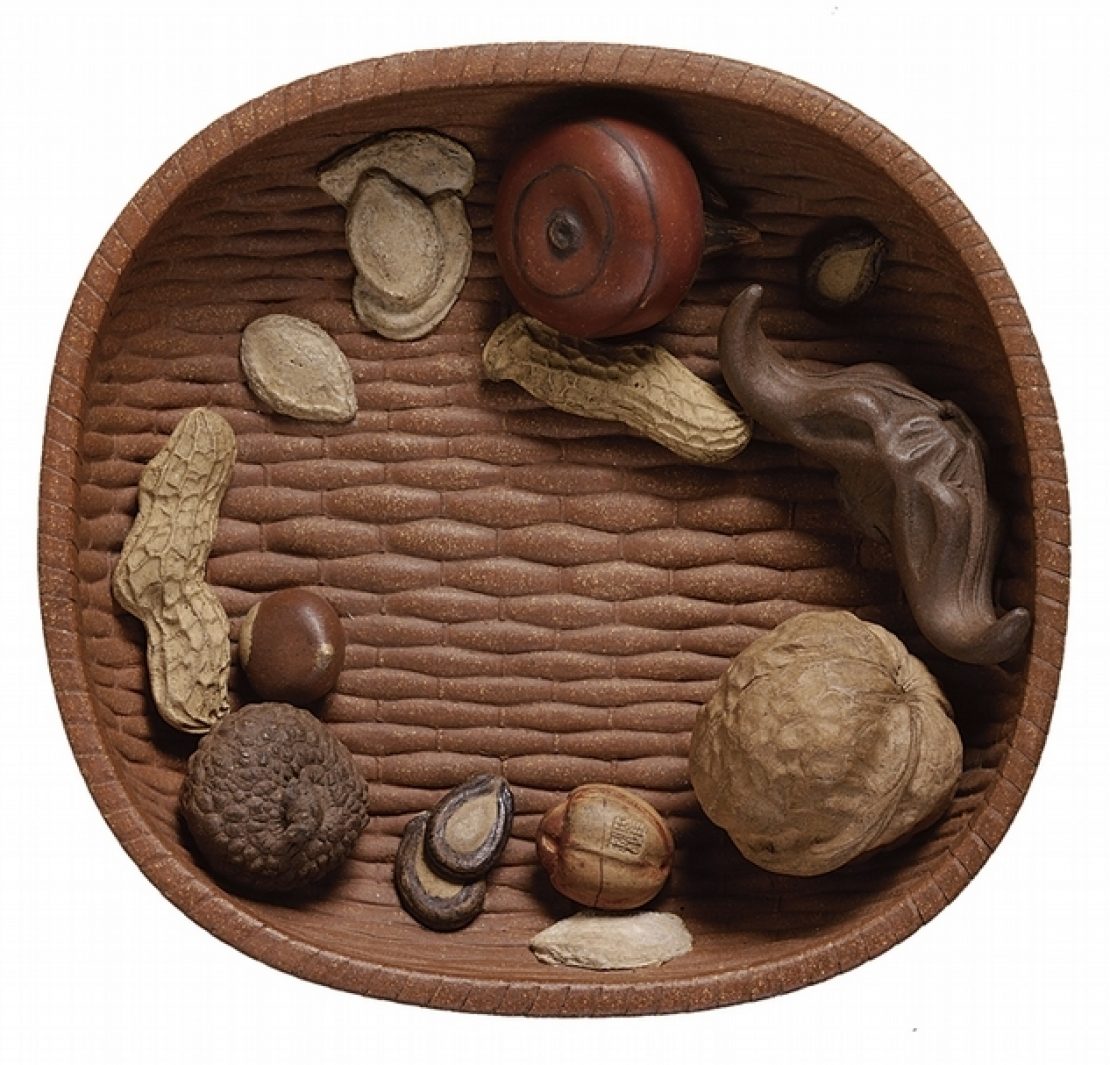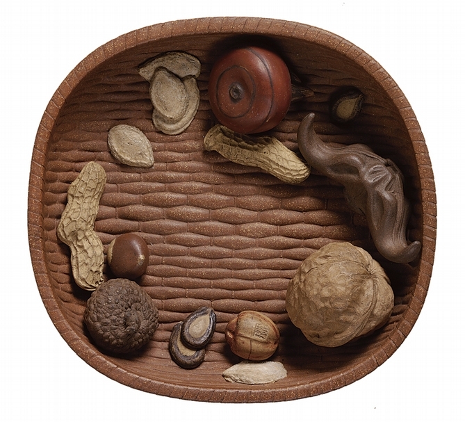 展覽最後兩個小展櫃,其中一個用來展出紫砂雕塑作品,讓觀眾了解紫砂器除了茶壺,其實還有其他很多不同種類,而且紫砂陶作為物料的可塑性也很高。這部分的展覽區展出傳為清代陳鳴遠的作品〈柳條果品〉(圖7)。〈柳條果品〉是V&A博物館於1983年購入的藏品,造型十分精緻,製作人仿製了藤編的方形小盤,內配各種大小不一的瓜果模型,作品色調自然和諧。陶盤裡其中一顆蓮子蓋有「鶴邨」印,有一說這是清康熙年間陶藝家陳鳴遠的別號。陳鳴遠以寫實紫砂雕塑聞名,他的創造性擴大了紫砂器能有的品種。由於陳鳴遠聲名遠播,導致後來在古玩市場裡出現不少高仿作品,也曾有學者對「鶴邨」印的可靠性提出懷疑(註9)。無論如何,V&A博物館館藏的〈柳條果品〉仍然是一件精美的作品,能用來展示陳鳴遠紫砂泥塑的傳統。另一件展出作品是陸文霞(1966~)的〈心上錢路〉,她雕塑了兩隻小鱉和一串錢幣,有一隻小鱉爬在錢幣上,一隻被壓在錢幣下,造型風趣幽默。陸文霞師從徐秀棠,作品底部除了有「文霞製」印,也有「秀棠指點」印。此作品形態大小適合把玩,應為放在茶桌上的「茶寵」。