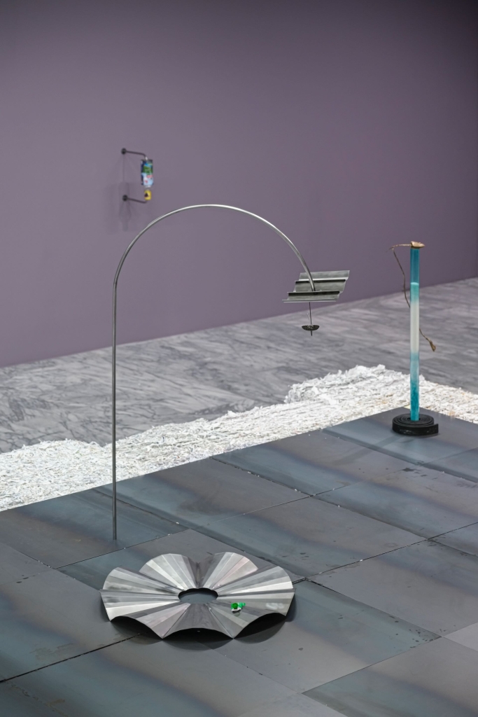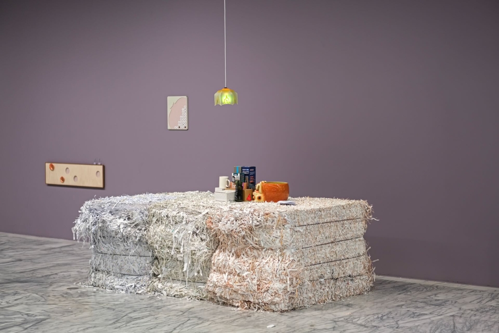 此外,藝術家也關注展覽結束後作品的去處,除了展覽中的現成物多是以可回收材質製作,其中廢比塔的基座與展場中穩住空間的大型裝置,由恆成紙業與致力紙品循環利用的廣源造紙合作製作。他們將數千萬條印刷廠裁切下來的邊角料回收壓製、綑綁成一塊塊巨大的立方體──它們既是作品的臺座,也像是對資源流動與剩餘的具體提問。