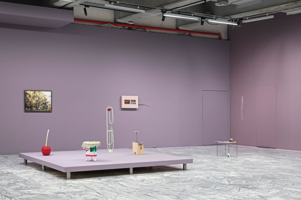 無獨有偶,展場中的多數作品,皆以玻璃、金屬等材質雕塑,以既熟悉又陌生的造型為展覽定下視覺基調,而這些物件經過重新拼貼與組裝,隨著觀者所處的文化脈絡,也產生出豐富的多層次聯想。像是《節日小點》、《活著遇見的好事》、《櫻桃貝克威爾聖代》中的櫻桃,以玻璃製作,不僅對照水果本身易腐爛的特性,產生一種逆反的張力;同時,玻璃的剔透與易碎,也呼應了櫻桃在文化脈絡中的華美與潛藏的危險性。在15至16世紀的荷蘭靜物畫中,櫻桃常作為表徵社會地位與國際貿易背景的象徵物;而在《波希失樂園》(The Garden of Bosch)這件三聯畫中,櫻桃則轉化為關於人類歡愉、慾望與墮落的象徵。