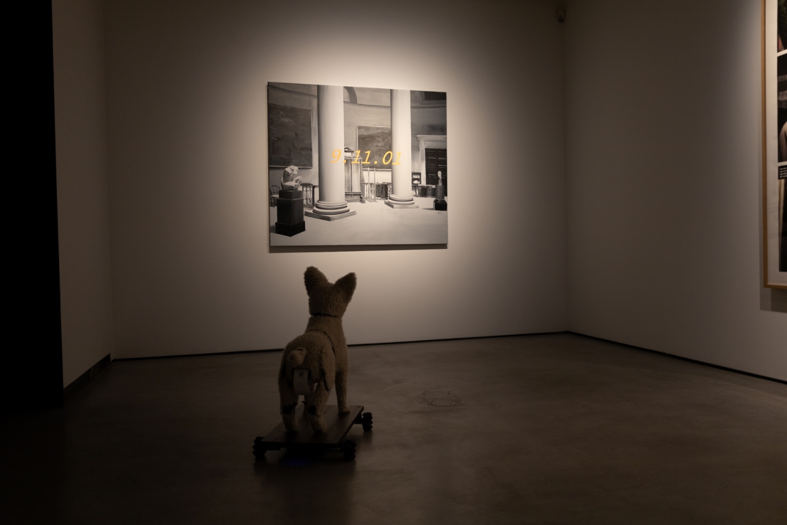 馬里奧.克林格曼的 AI 機器人雕塑《A.I.C.C.A.》(Artificially Intelligent Critical Canine)於西班牙馬德里 Espacio SOLO 展覽《Handle With Care》展出期間演出現場一景。(© Mario Klingemann,Courtesy of Onkaos)